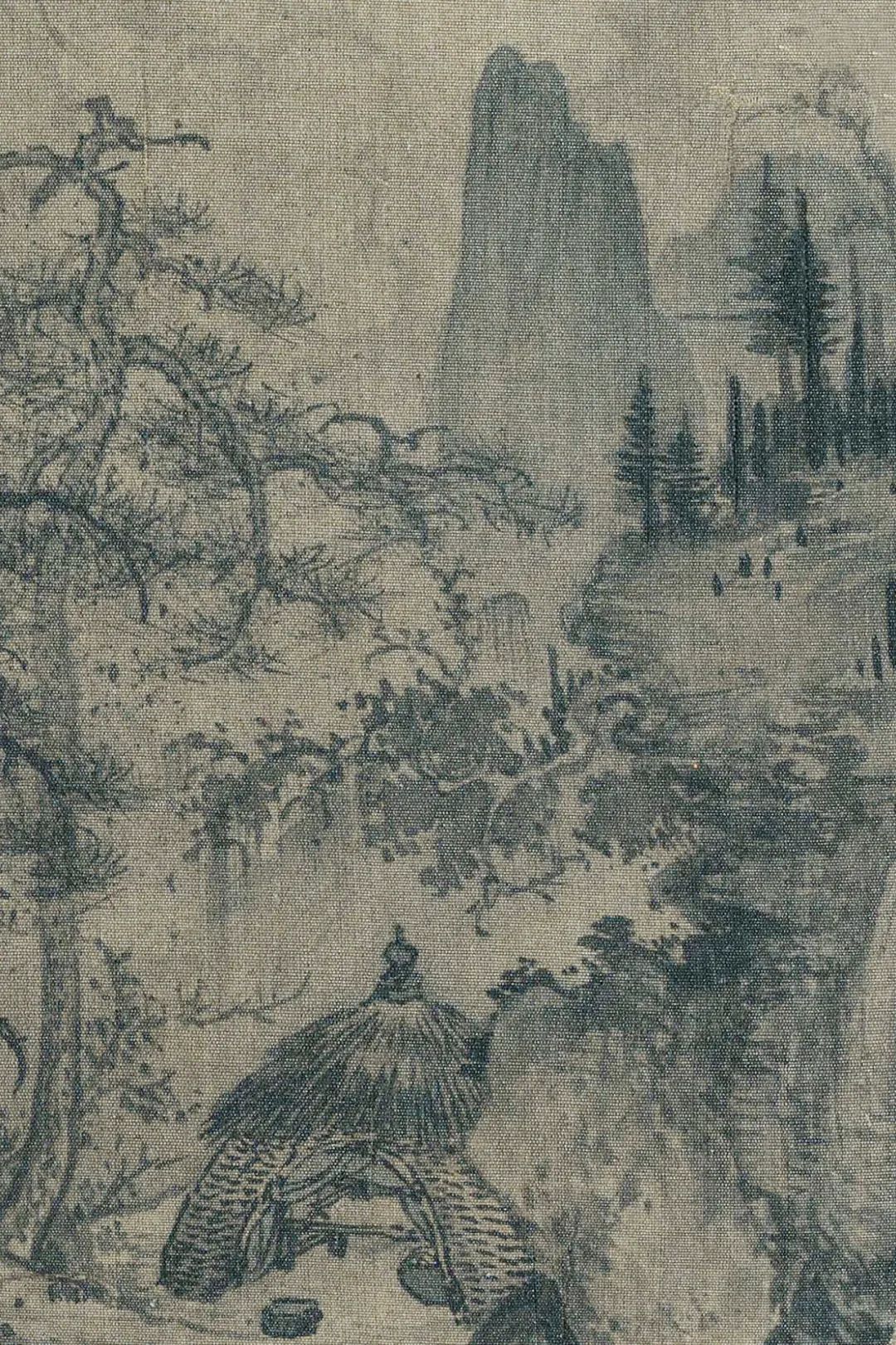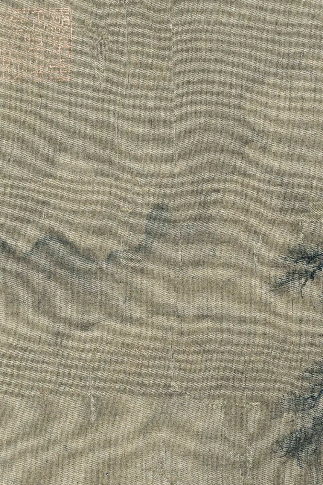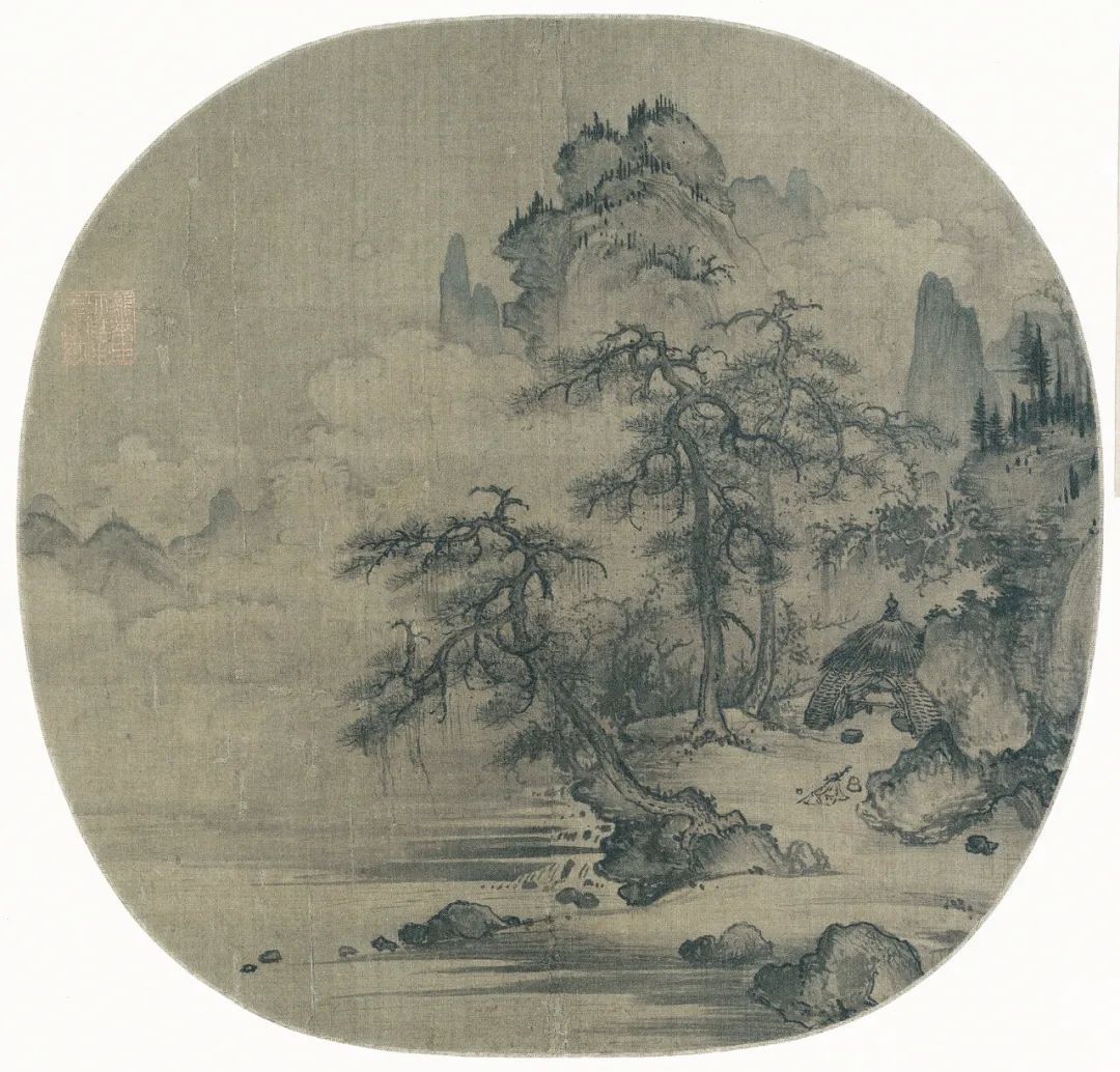 画面以云雾为媒介,将“行到水穷处,坐看云起时”的王维诗意具象化。近景的苍松茅庐与远景的隐约山峦,被流动的云雾切割成多个时空片段。这种“边角式”构图,打破了北宋山水对中景的详尽描绘,转而以虚实相生的手法,让观者仿佛置身于一个可游可居的“折叠时空”。云雾既是物理空间的隔断,更是心理时间的缓冲——老者席地观云的姿态,恰似南宋文人在乱世中寻求精神栖息地的隐喻。
