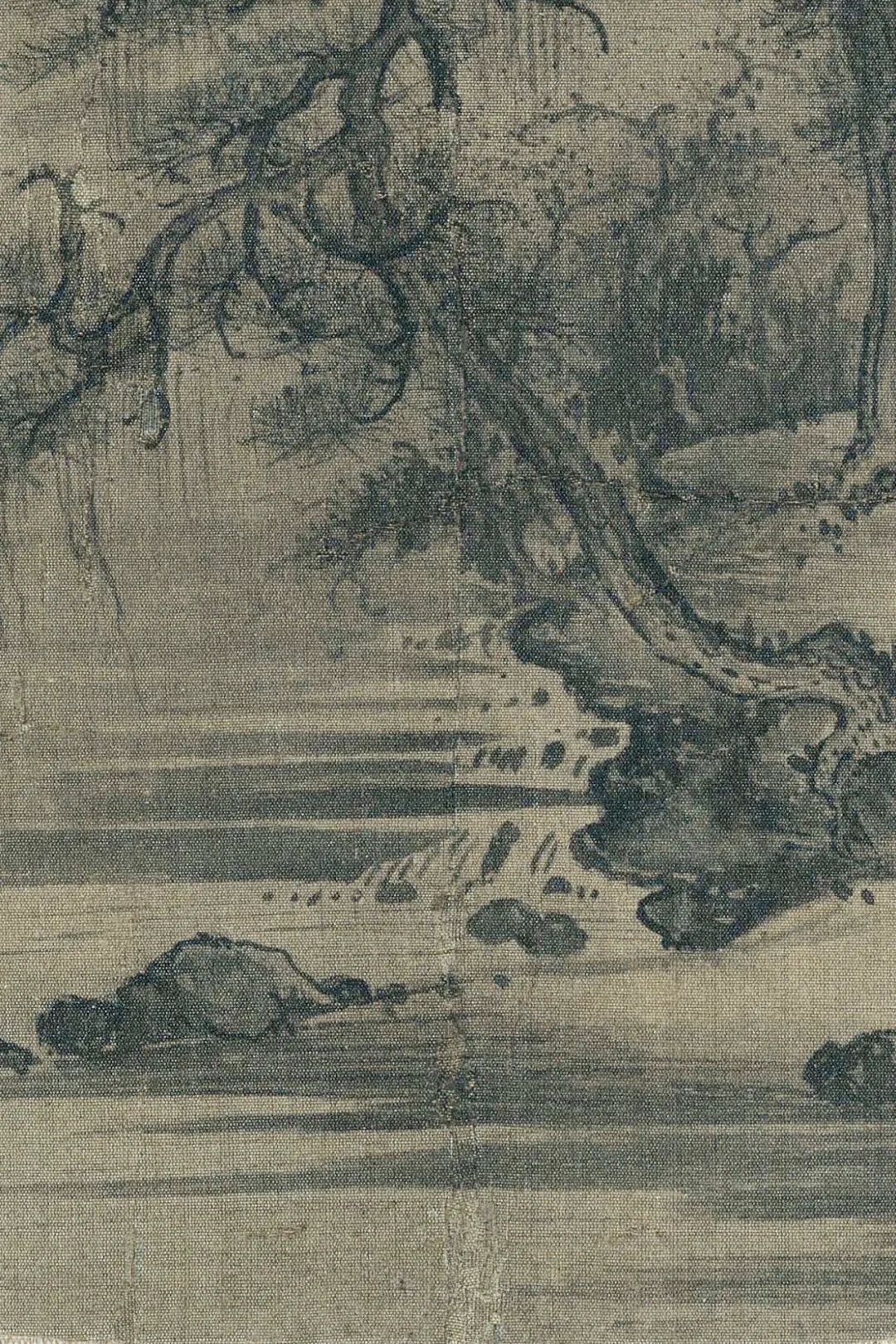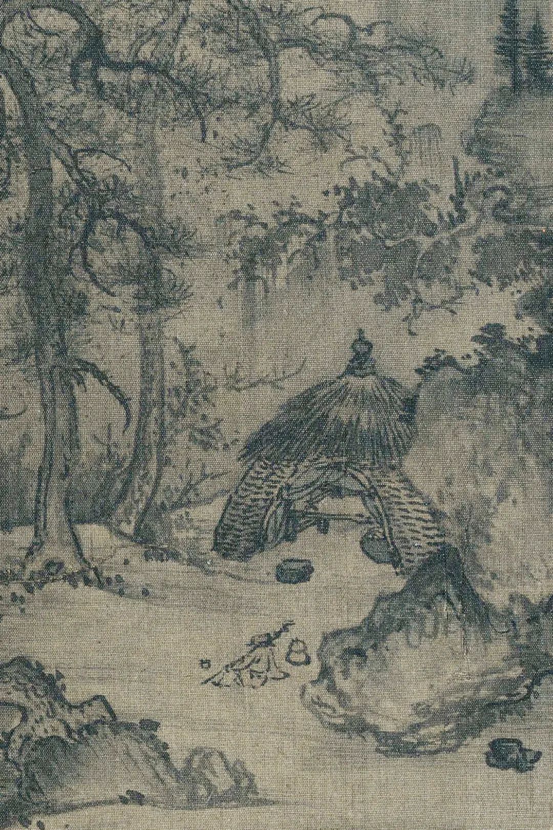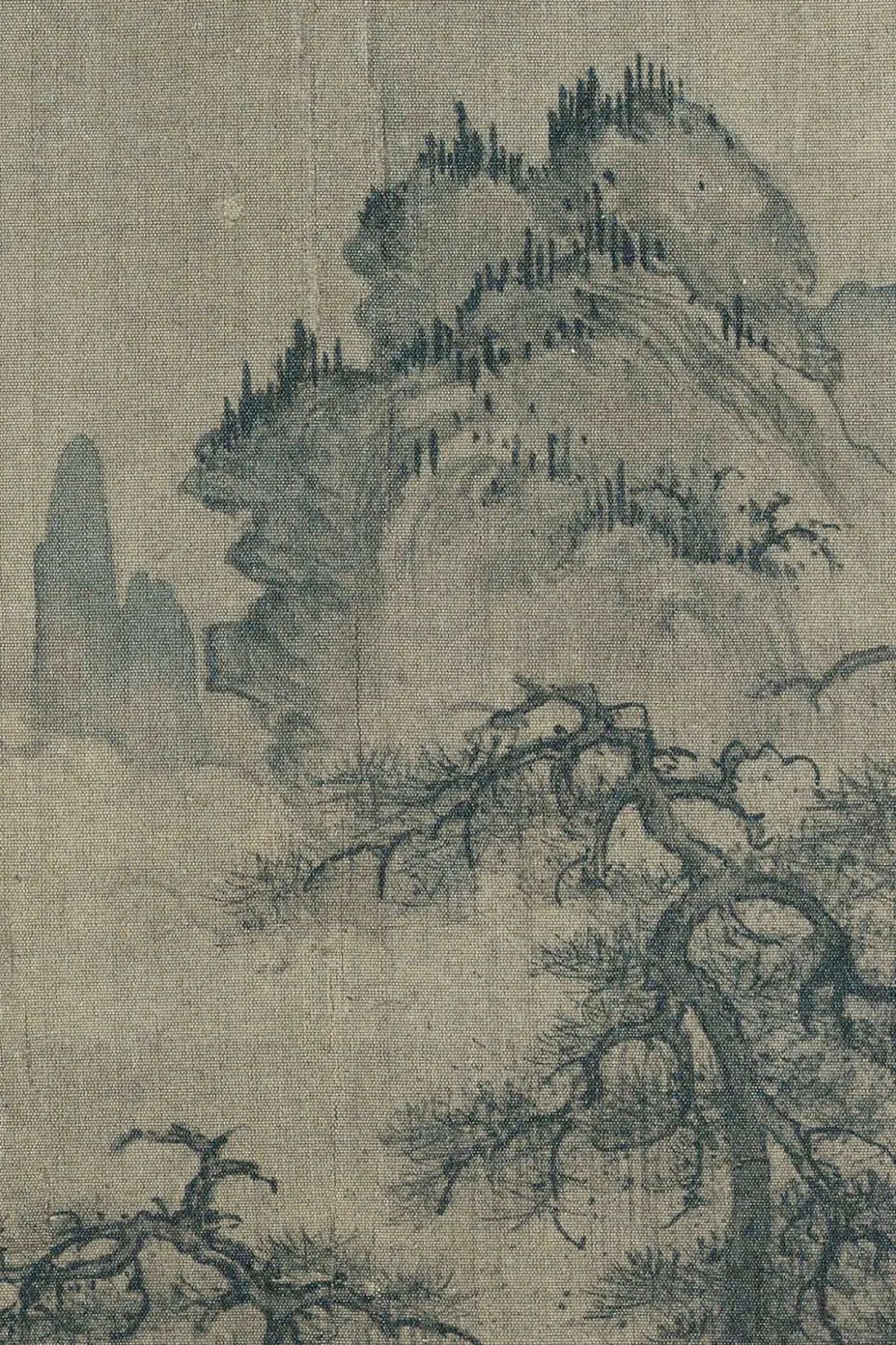 画面以云雾为媒介,将“行到水穷处,坐看云起时”的王维诗意具象化。近景的苍松茅庐与远景的隐约山峦,被流动的云雾切割成多个时空片段。这种“边角式”构图,打破了北宋山水对中景的详尽描绘,转而以虚实相生的手法,让观者仿佛置身于一个可游可居的“折叠时空”。云雾既是物理空间的隔断,更是心理时间的缓冲——老者席地观云的姿态,恰似南宋文人在乱世中寻求精神栖息地的隐喻。