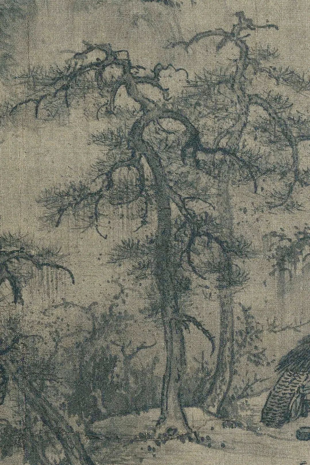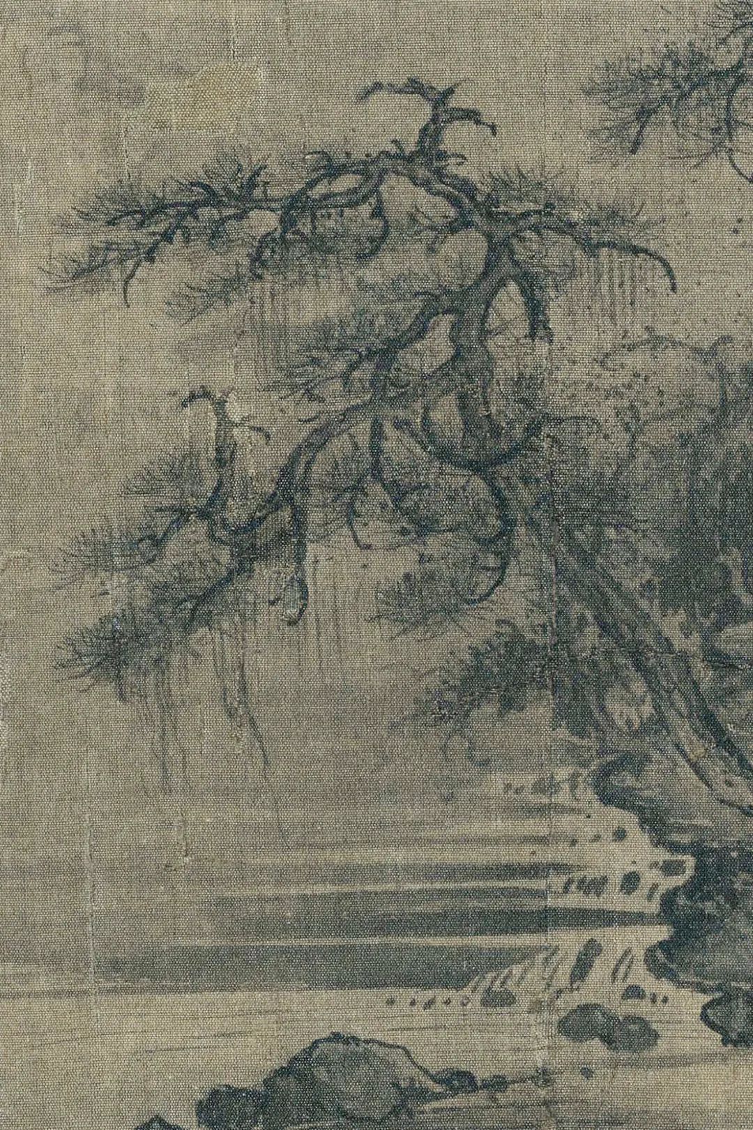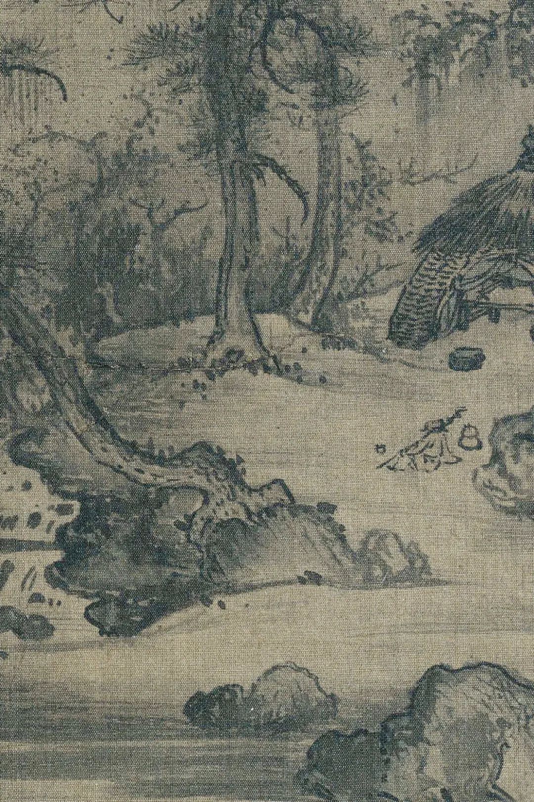 松枝的蟹爪形与山石的卷云皴,是李成、郭熙一派的标志性语言。但画家在师法古人的同时,以淡墨晕染的明月与墨线勾廓的白云,赋予传统技法以新的生命。这种“守正创新”的矛盾,恰似南宋文人面对北方沦陷后的文化身份焦虑:既需承续北宋文脉,又要在异族统治下寻找新的表达方式。画中老者身旁的葫芦与器物,或许正是这种文化困境的物化象征——葫芦象征“隐逸”,器物暗示“入世”,二者在画面中达成微妙平衡。