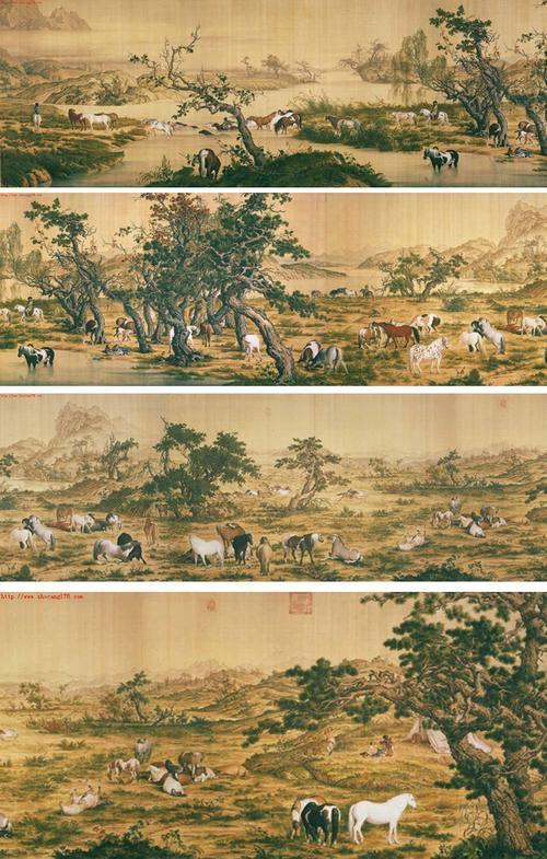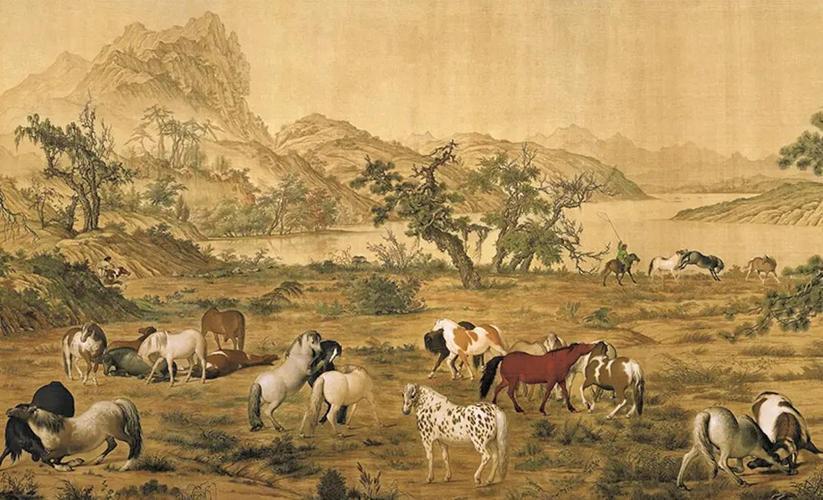 清代郎世宁画的。意大利传教士,却成了清宫画师。一百匹马,姿态万千。既有西方的写实光影,又有东方的笔墨韵味。