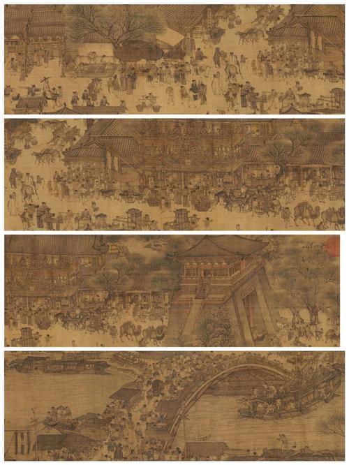 北宋张择端画的。汴京(开封)的市井全景,汴河上漕运繁忙,街道上店铺林立,人物百态,有小贩、船夫、官员、百姓。