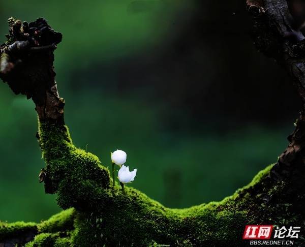 深褐的老枝上,苔藓铺成柔软的绒毯,细小的白花从苔丝间探出头,与刚冒尖的蕨类相映成趣。那些带着露珠的花苞,在暗绿背景里格外鲜活,像无数个攥紧的小拳头,要把整个春天的力气都攒在绽放里。